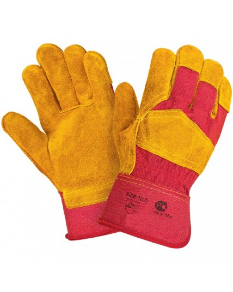 Перчатки предназначены для защиты от механических воздействий, комбинированные, плотная смесовая ткань красного цвета со спилком, защитная крага (прорезиненный жесткий защитный манжет), флисовая подкладка из хлопка на ладонной части и пальцах, иобеспечивает лучшую защиту пальцев от швов и комфорт. Спилок КРС, шлифованный, желтого цвета, двойные швы.